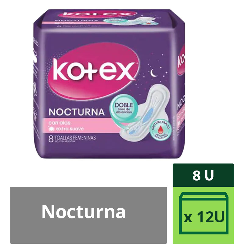 Toallitas Femeninas Kotex Nocturna Con Alas Extra Suave X 8 Un